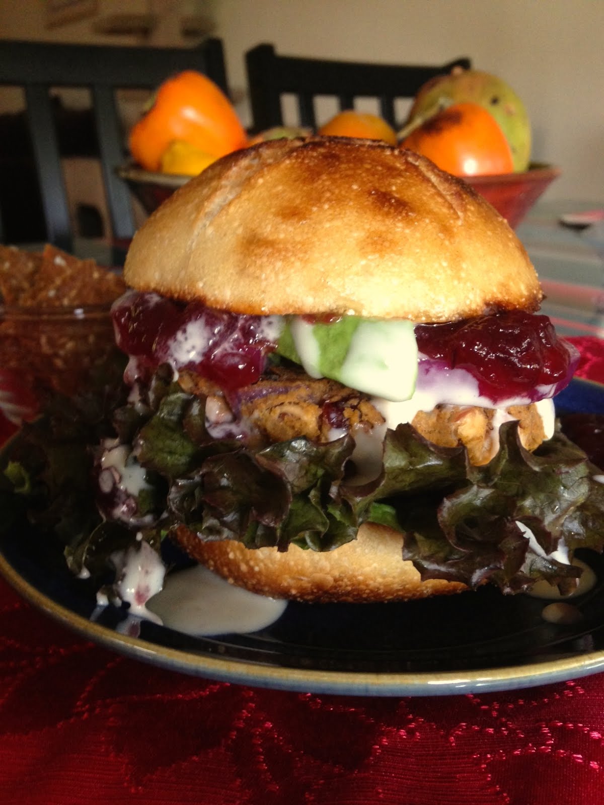 When burgers are done, serve hot on toasted European-style crusty hard rolls, topped with lettuce, sliced avocado, sesame dressing, cranberry sauce, and sliced red onion, if desired. Makes 4 servings.